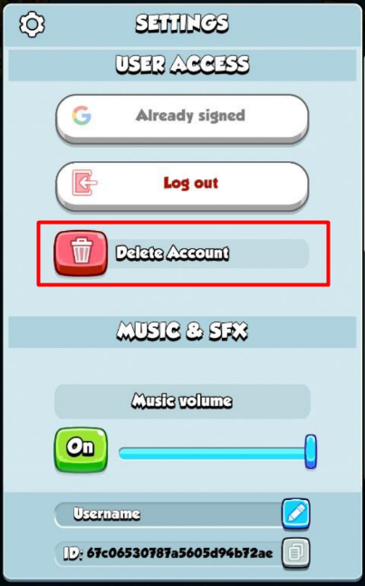 Important: Tapping "Delete Account" will permanently erase your game data, including your progress and username. This action cannot be undone. If you're looking to start fresh, deleting your account will reset your progress so you can begin again from scratch by creating a new account.